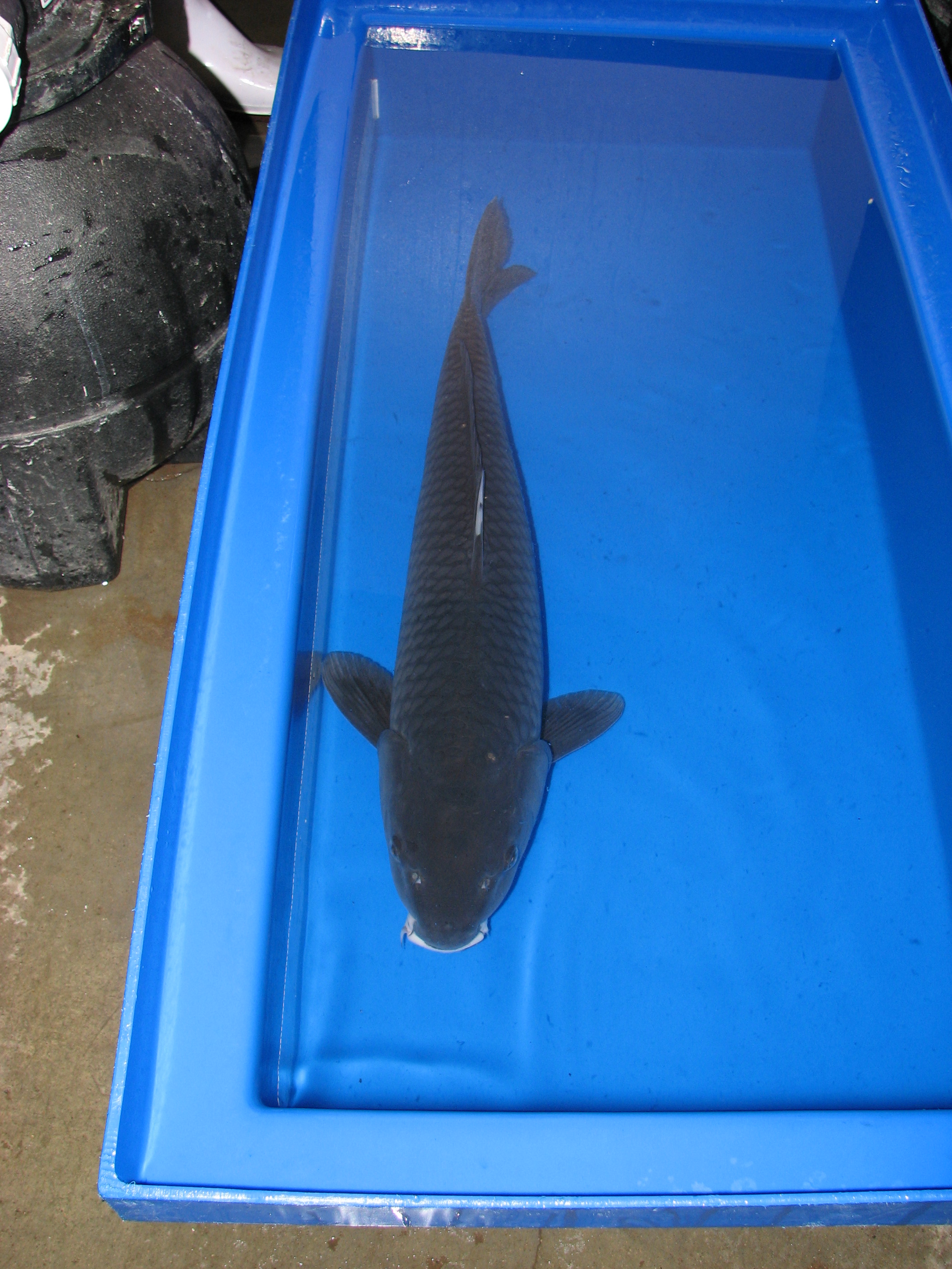 Haijiro are Koi that are solid black with white tipped fins. When buying a Haijiro, look at the white on the fin edges and make sure it is even with the other side. Check the fish over for any old scars or bad scales, for these will take away from the look of the Koi.